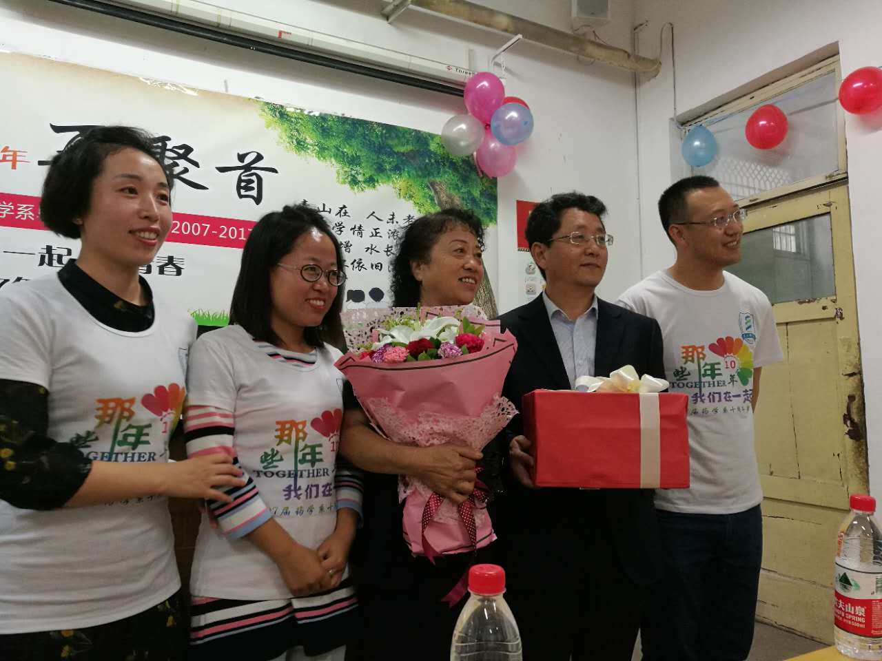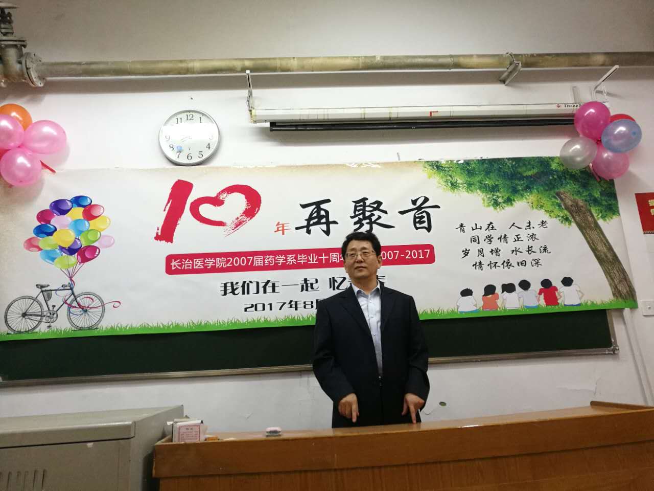 8月26日上午,药学系2007届毕业生相聚母校合影留念,学院副院长宋晓亮、原药学系副主任郑王巧以及部分教师参加了此次聚会。合影之后,大家来到了44教,在这里他们度过了生命中最重要最美好的四年时光。在教室里,学子们再一次坐在了自己曾经熟悉无比的座位上,聆听了宋晓亮副院长的讲话。宋晓亮副院长向大家介绍了药学系开拓、发展、壮大的历程以及目前在教学、科研方面取得的一系列成绩,表达了对学子们相聚母校的热烈欢迎,真诚地希望同学们以自己毕业十年的经历对药学系的培养方案、课程设置等方面提出意见和建议,最后亲切地祝福大家在今后的人生旅途中家庭幸福!事业辉煌!讲话结束后,2007届毕业生代表刘旺系里赠送药典一套