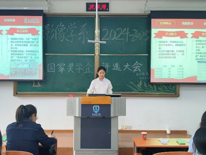 大会开始,十位候选人依次登台,通过PPT演讲的形式进行陈述,分享自己在思想政治、学习情况、素质拓展、社会实践、获奖情况、体育活动等方面的成长经历和收获,充分展现出影像学子“厚德、精业、济世、报国”的使命担当。根据评委们的综合评议,庞娅璇、杜佳亮、田馨怡三位同学最终脱颖而出,成功获得推荐资格,将代表我系参加校级国家奖学金评选。