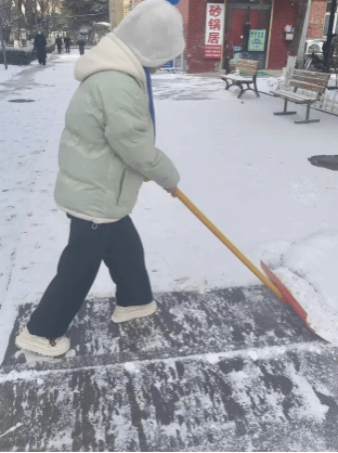 现场分工协作、配合默契:有人挥舞铁锹,铲雪破冰;有人手持扫帚,清扫路面;还有人负责将积雪搬运至指定区域。寒风很快吹红大家的脸颊,雪水浸湿衣衫,却无人停下手上的动作。