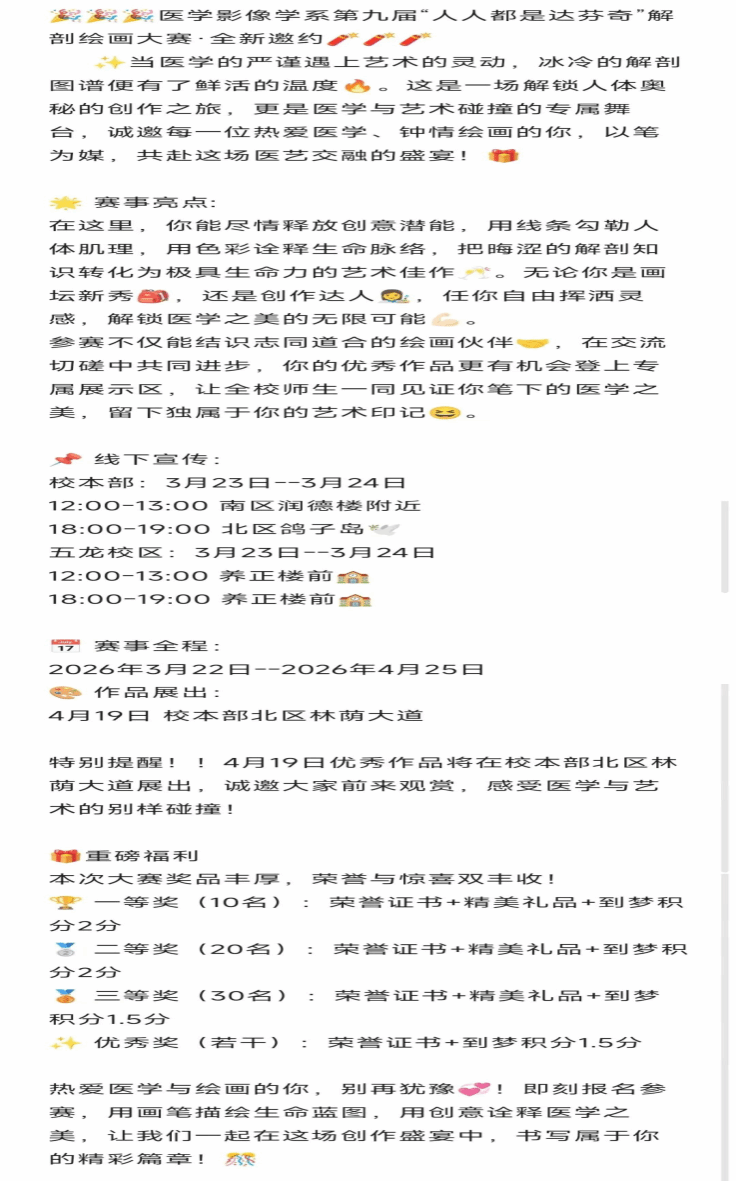 (5)作品展览:优秀作品将于4月19日在微信公众号(线上)、北区林荫道(线下)展出。